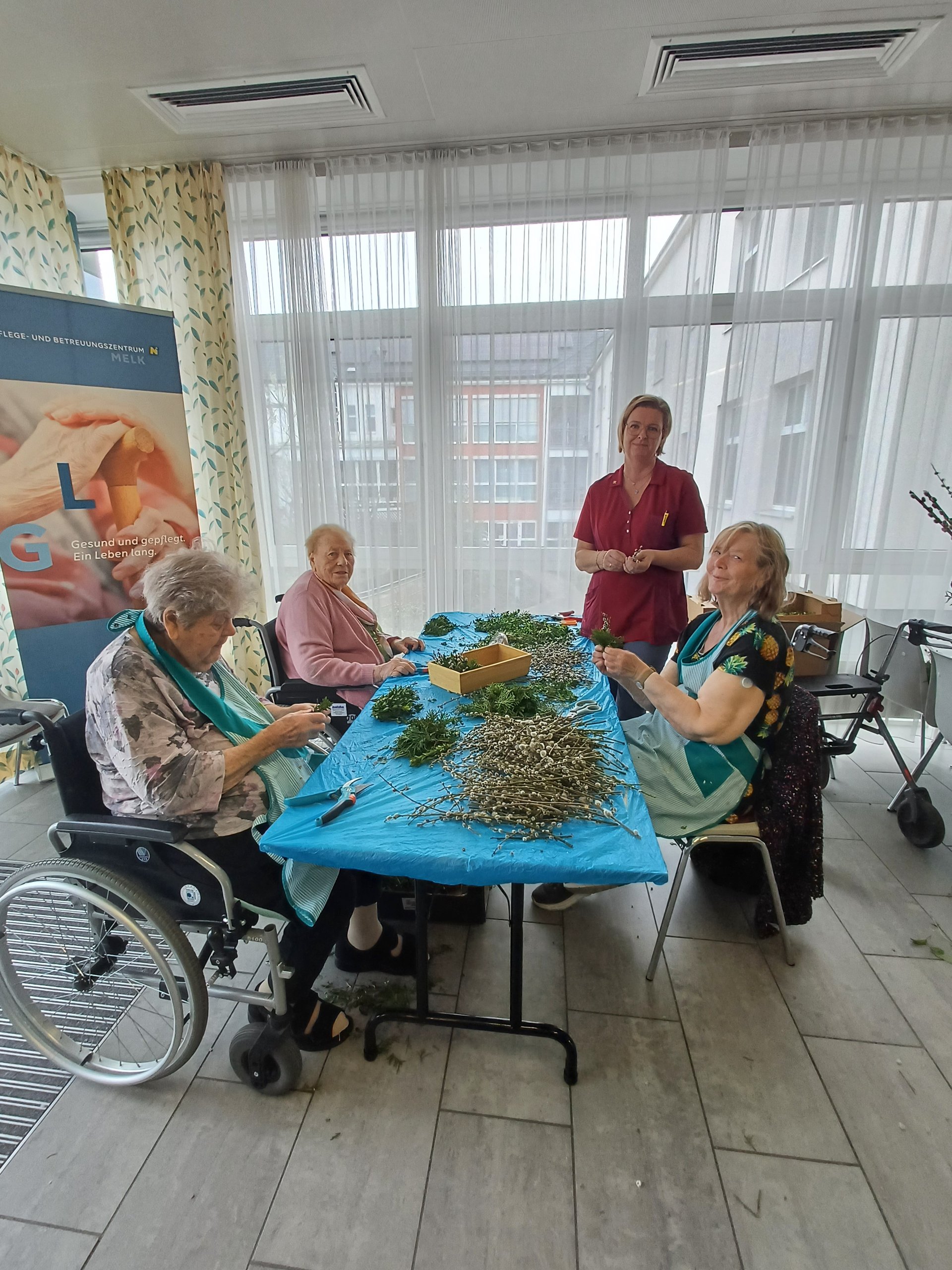 Auch wir binden mit den BewohnerInnen jedes Jahr Palmbuschen. Heuer wurden es 115 große und ca. 100 kleine für die Zimmer der BewohnerInnen.