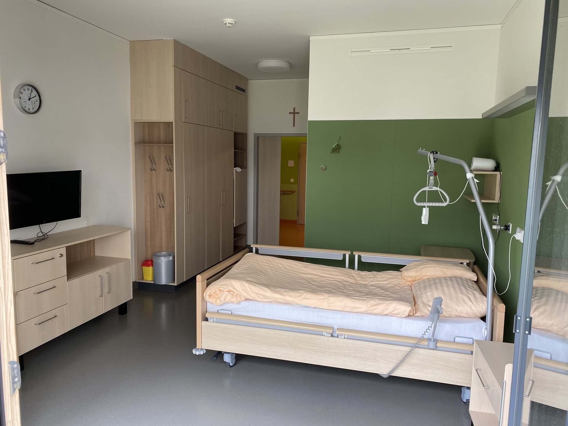 Jede Einheit besteht aus Zimmer, Vorraum sowie Dusche und Toilette. Spezielle Pflegebetten, bei Bedarf modernste Lagerungsmatratzen und Sitzgelegenheiten in den Zimmern garantieren größtmögliche Sicherheit und Komfort. Zusätzlich gibt es in den meisten Zimmern Einbaukästen und Kühlschränke. Der Anschluss für Kabel-TV gehört zur Grundausstattung. Eigene Möbel können – sofern genügend Platz vorhanden ist – mitgenommen werden. Alle öffentlichen Bereiche des Hauses sind barrierefrei ausgestattet und frei zugänglich.